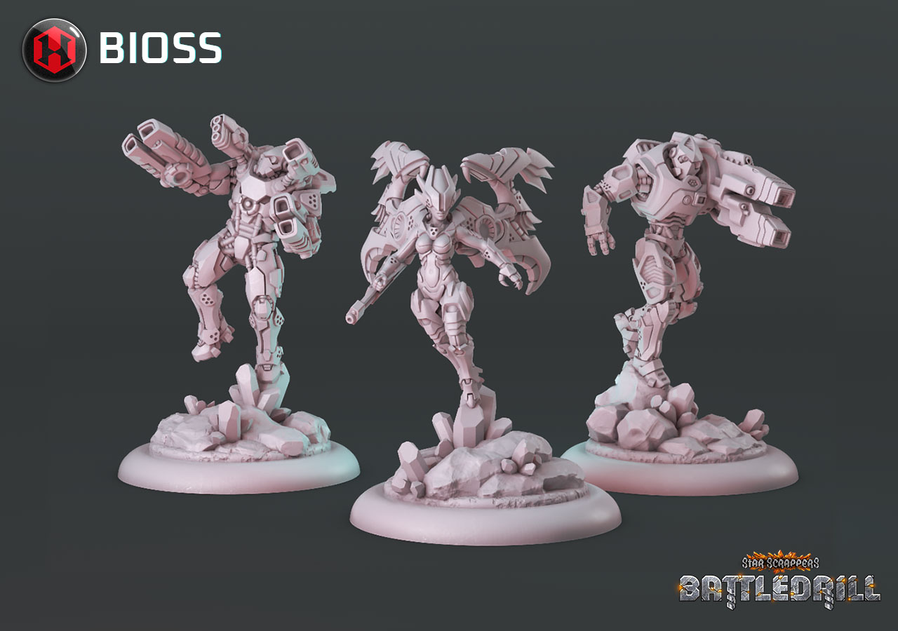 Star Scrappers: Battledrill comes in a unique Print3D’n’Play format. All content necessary to play the game is provided in a printable digital form. You don’t need to buy a physical rulebook, miniatures, cards or tokens, everything can be downloaded and printed out at your convenience from STL and PDF files. All 3D models are optimized for the most popular home-use 3D printing machines. To play a game of Battedrill, you will need miniatures with their stat cards, dice, measure widgets (or a measure tape) and a table (min. size of 36” x 36”) that will represent the battlefield of the skirmish between two opposing crews controlled by the players. Every model has a set of unique statistics and abilities, whose wise use is the key to victory. The players perform available actions with their miniatures, taking part in quick, dynamic, yet deeply tactical battles.