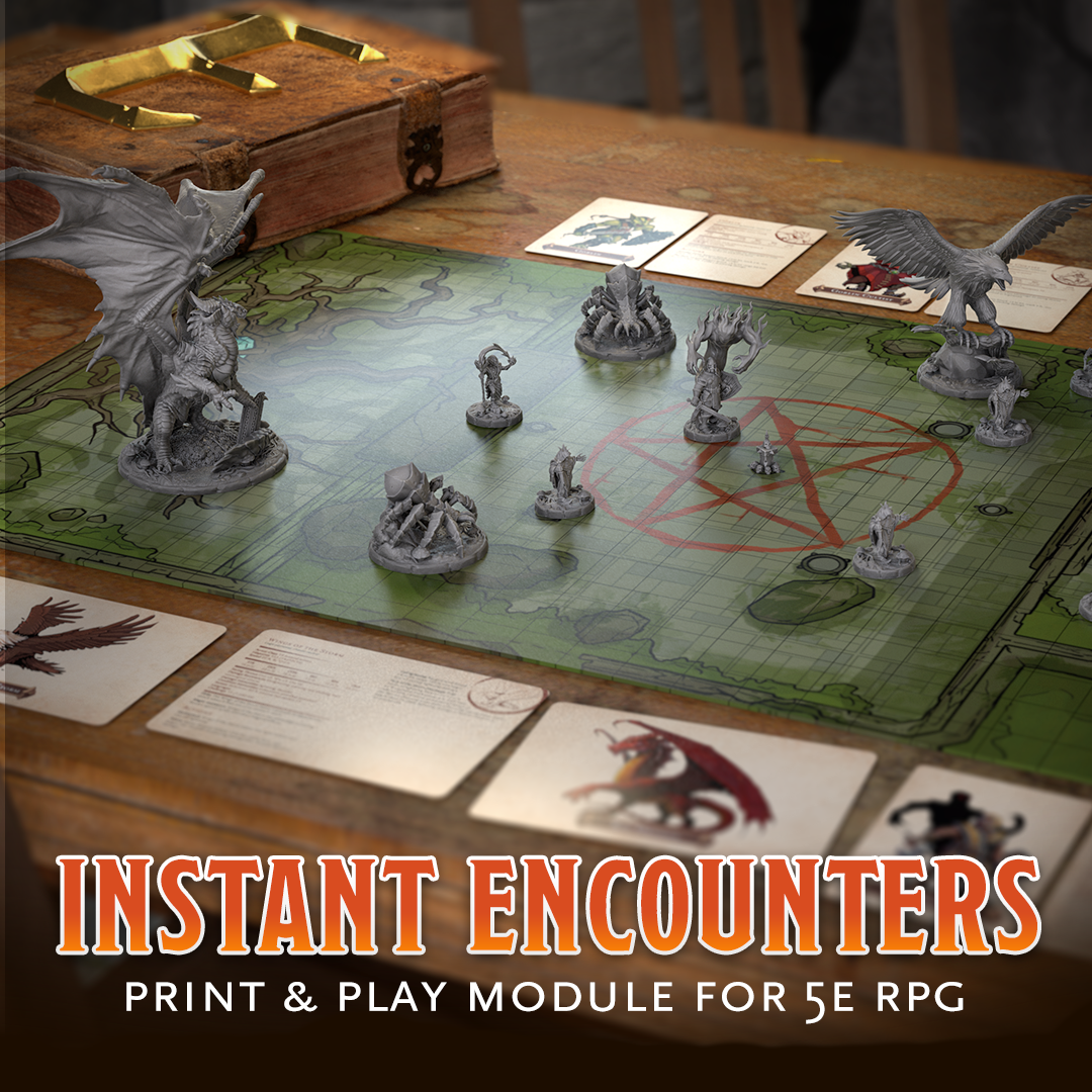Ready to print and play 5E encounters including detailed descriptions, story hooks, rules, pawns, battle maps and pre-supported 3D monsters. Thanks to this 5E module, you will run epic battles which your players will remember for a long time. Detailed descriptions and scalable challenge rating will allow you to customize the encounters and adjust them to your players’ experience and their characters’ levels. Every monster used in our encounters is represented by a colorful pawn and a 3D miniature. They can be printed at home in any number needed for a specific difficulty level. Large maps will bring your battlefields to life, and handy stat cards will let you avoid searching the bestiary during the session.