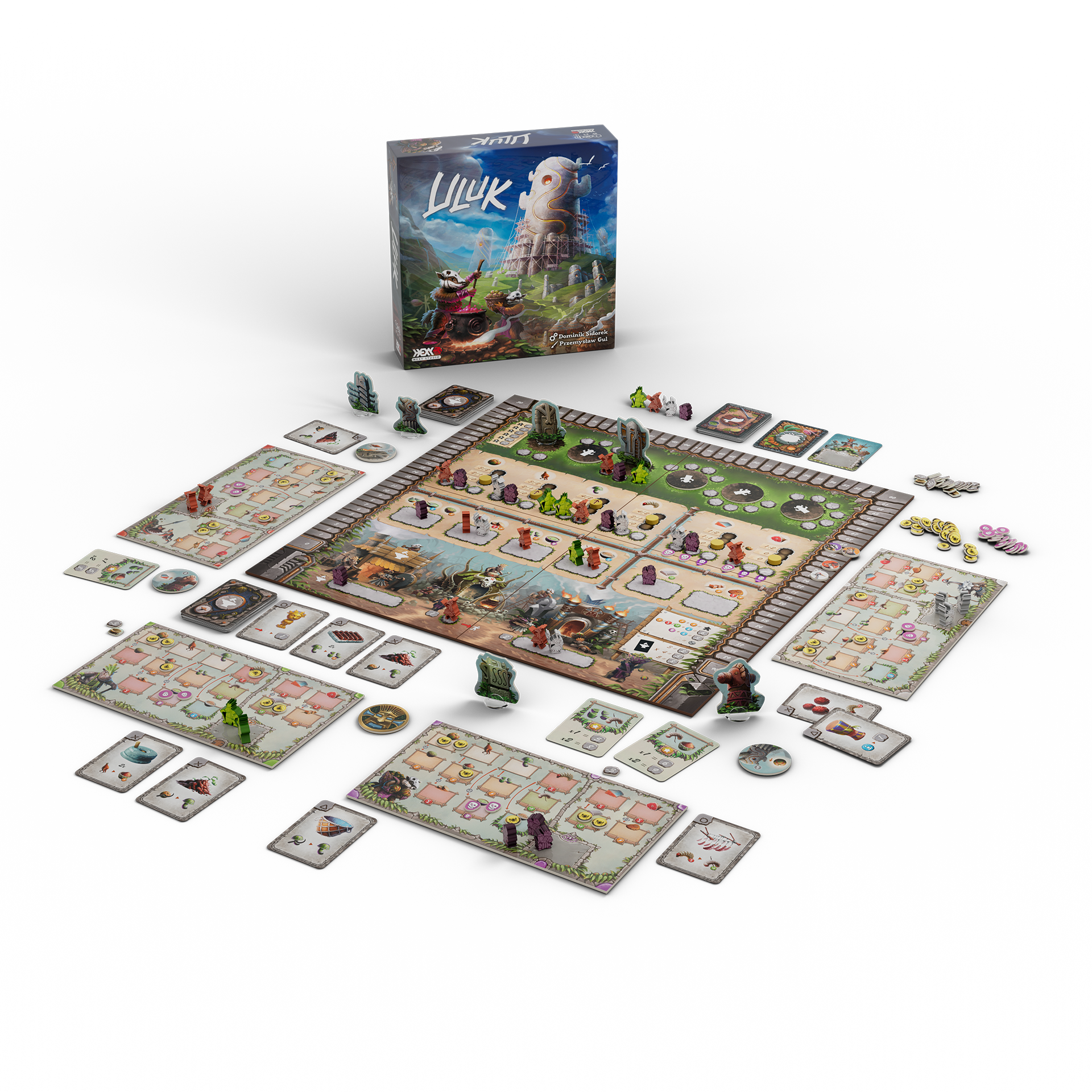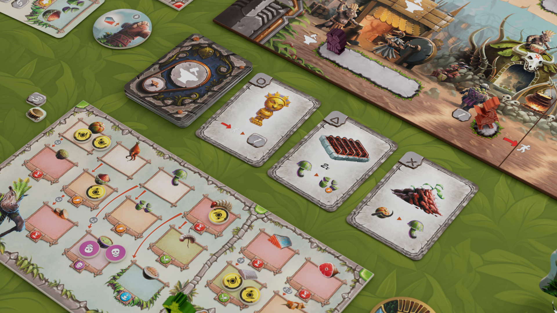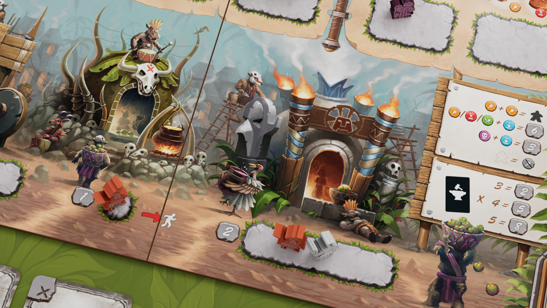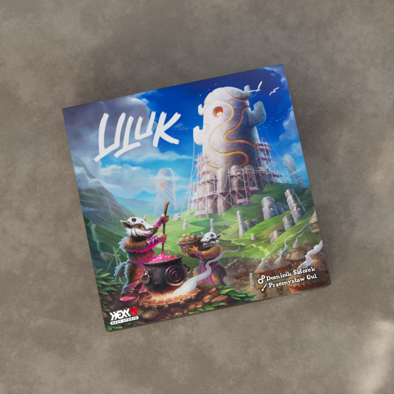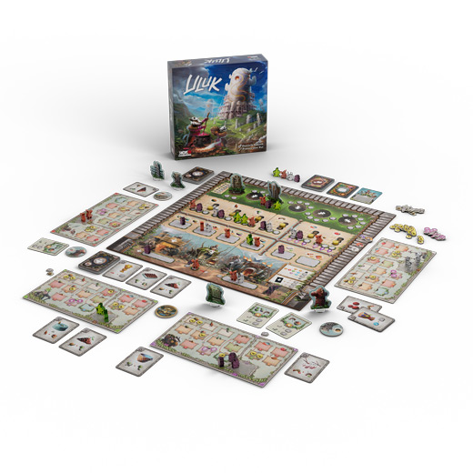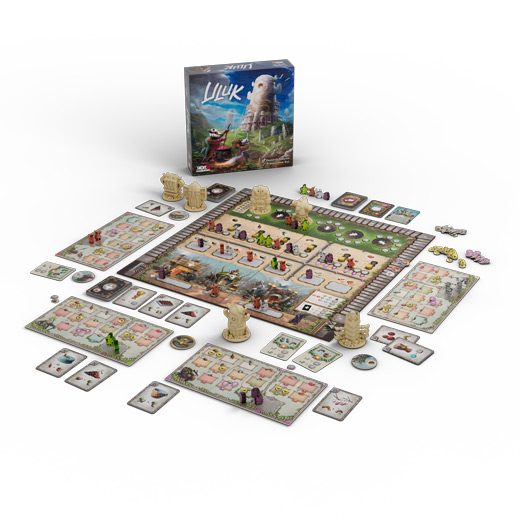Uluk mostly makes use of the classic worker placement mechanics. The players send their tribers to spaces on the main board to build monuments and gather raw resources. The resources gathered are stored on each player's tribe board and may then be processed into food. Feeding your tribers brings you HPs and lets you win the game after the sixth season. A single season is divided into six phases in which the players take their actions in a clockwise order: