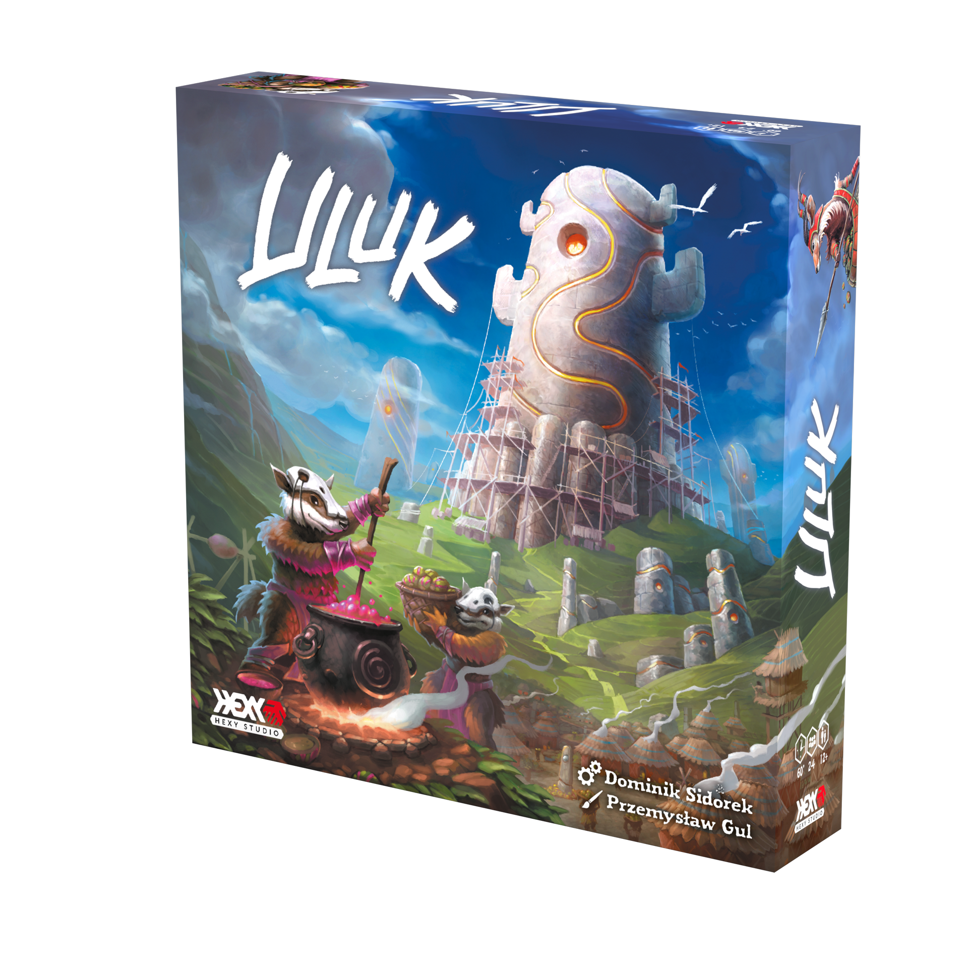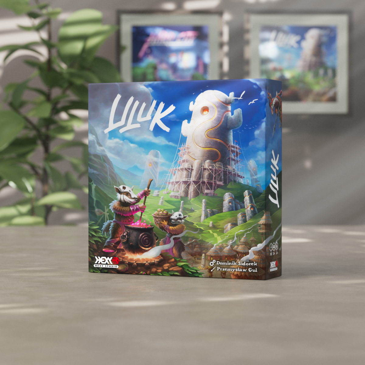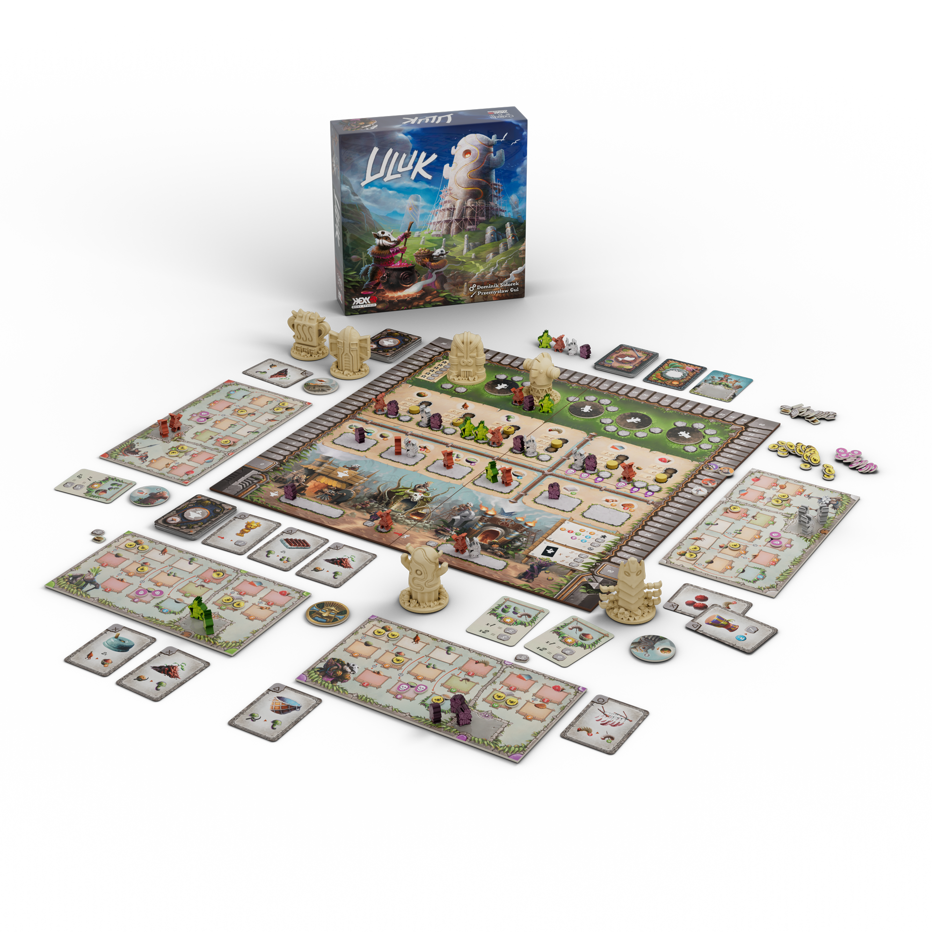 Uluk mostly makes use of the classic worker placement mechanics. The players send their tribers to spaces on the main board to build monuments and gather raw resources. The resources gathered are stored on each player's tribe board and may then be processed into food. Feeding your tribers brings you HPs and lets you win the game after the sixth season. A single season is divided into six phases in which the players take their actions in a clockwise order: